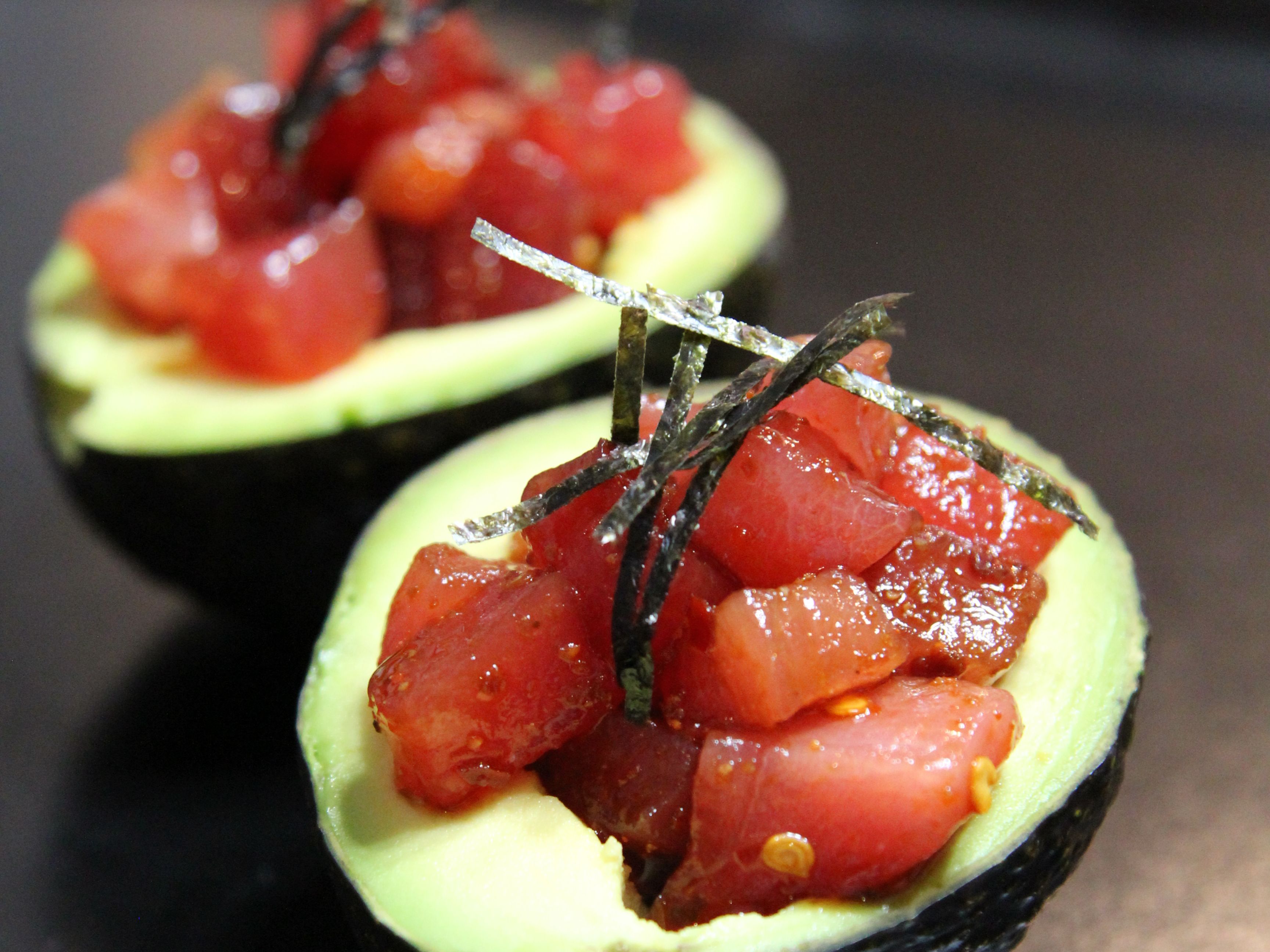 Avocado as a bowl, ahi tuna, homemade poke sauce (spicy hot), topped with sesame seed and nori shredded.