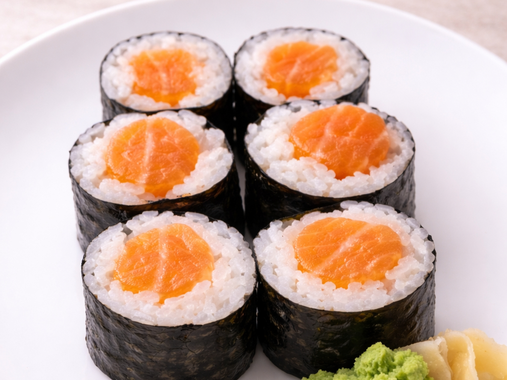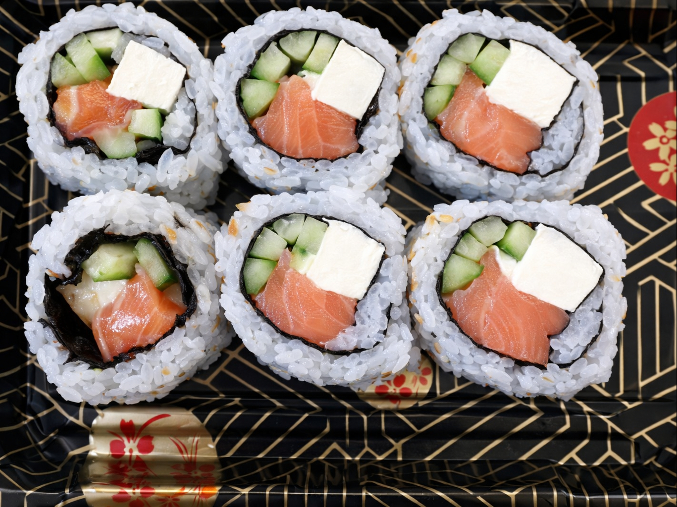 Nori, sushi rice, smoked salmon, cream cheese, cucumber, sesame seed.