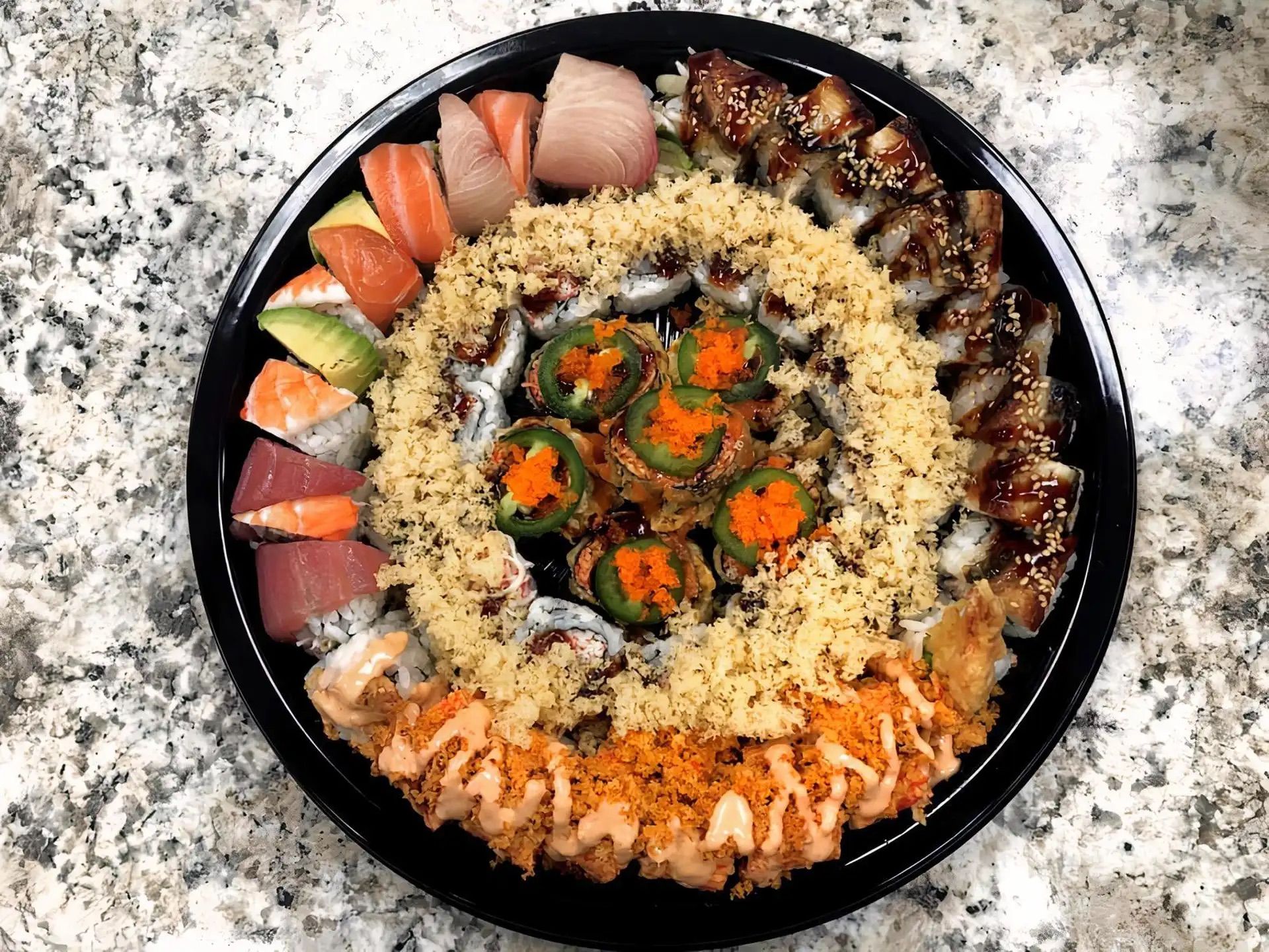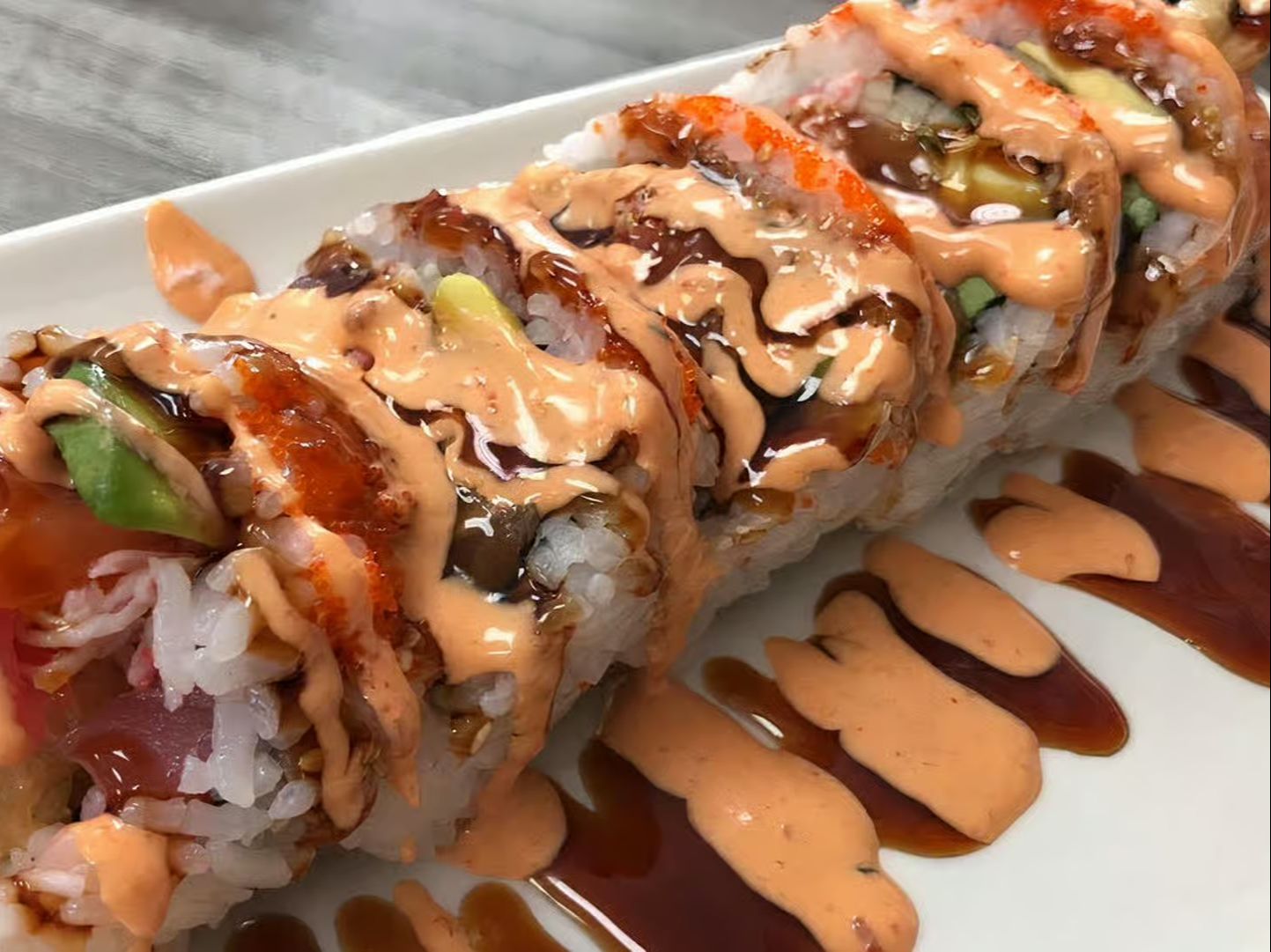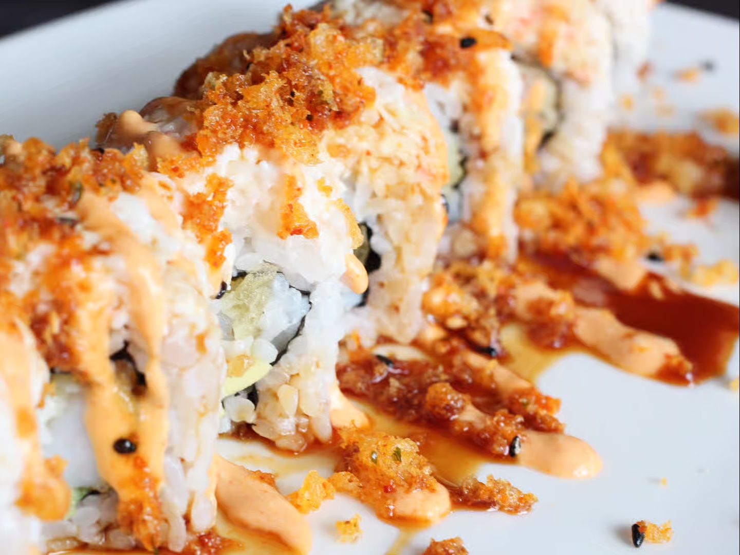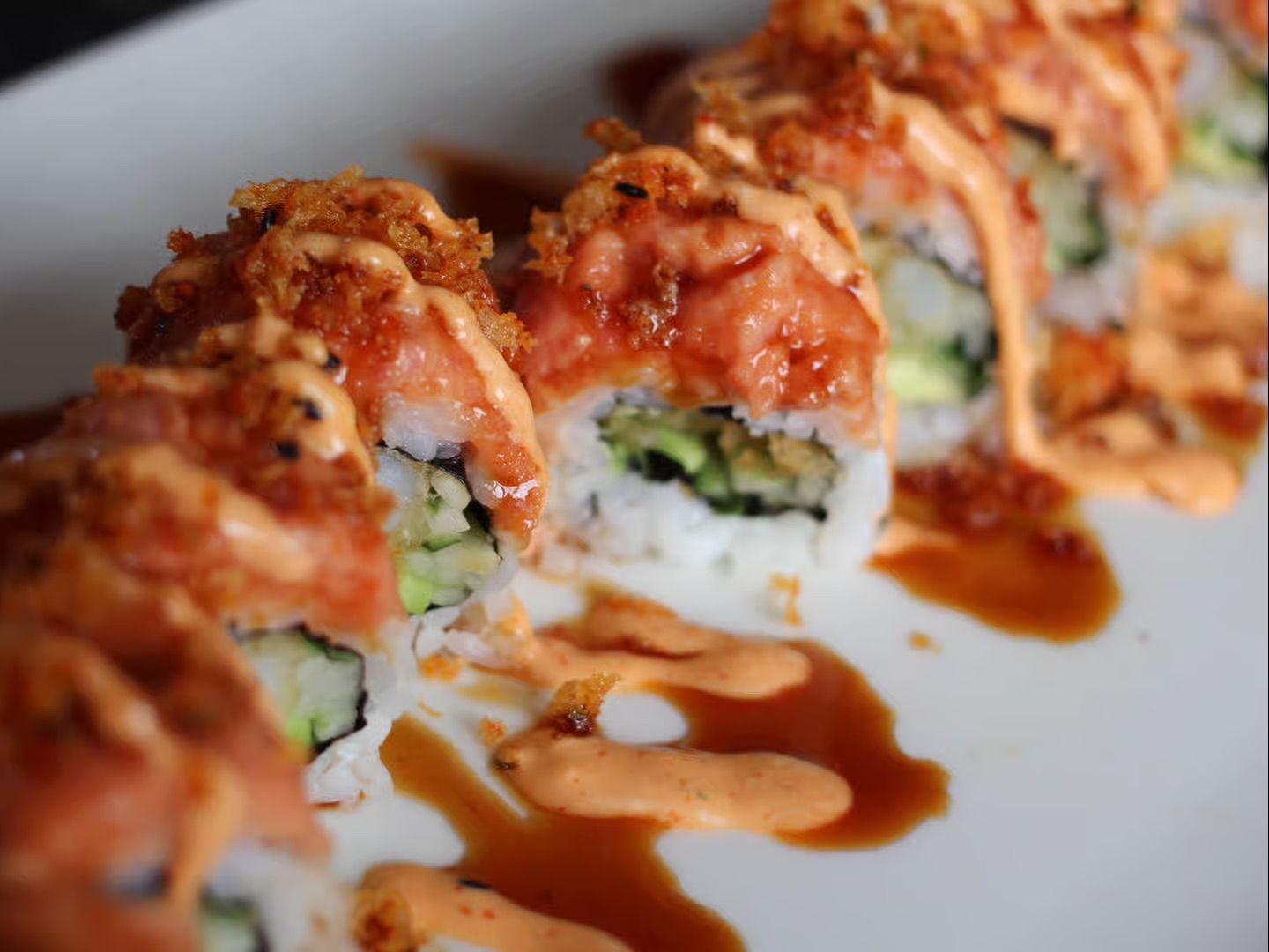 Nori, sushi rice, salmon, tuna, shrimp tempura, imitation crab shredded, avocado, cucumber, topped with eel sauce, spicy mayo and masago.