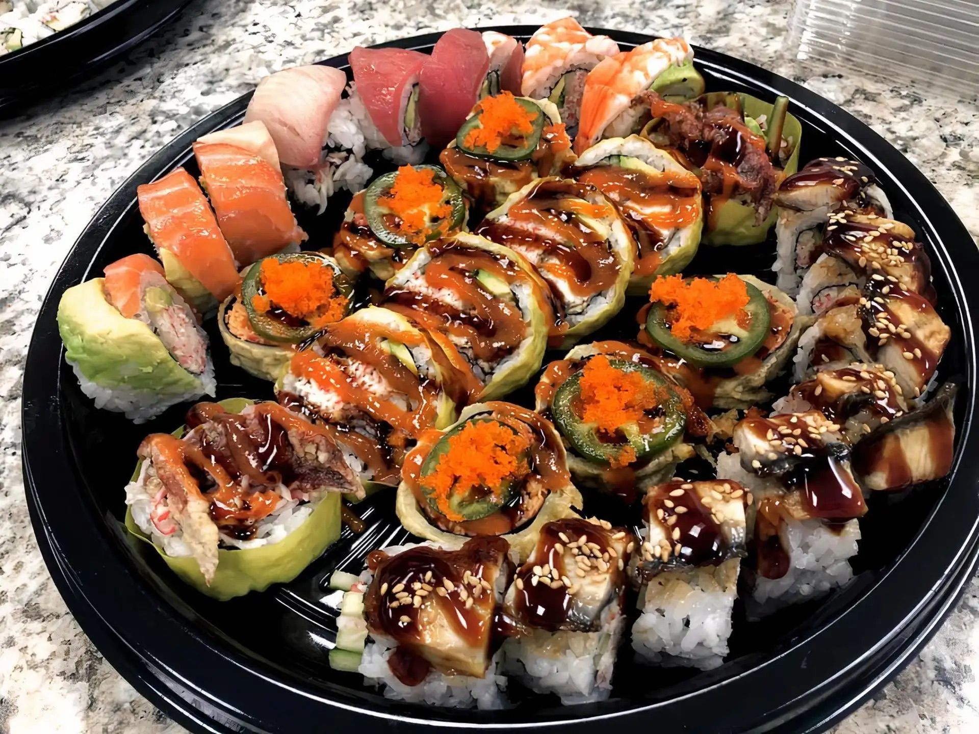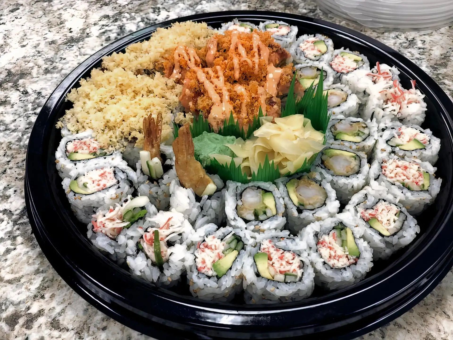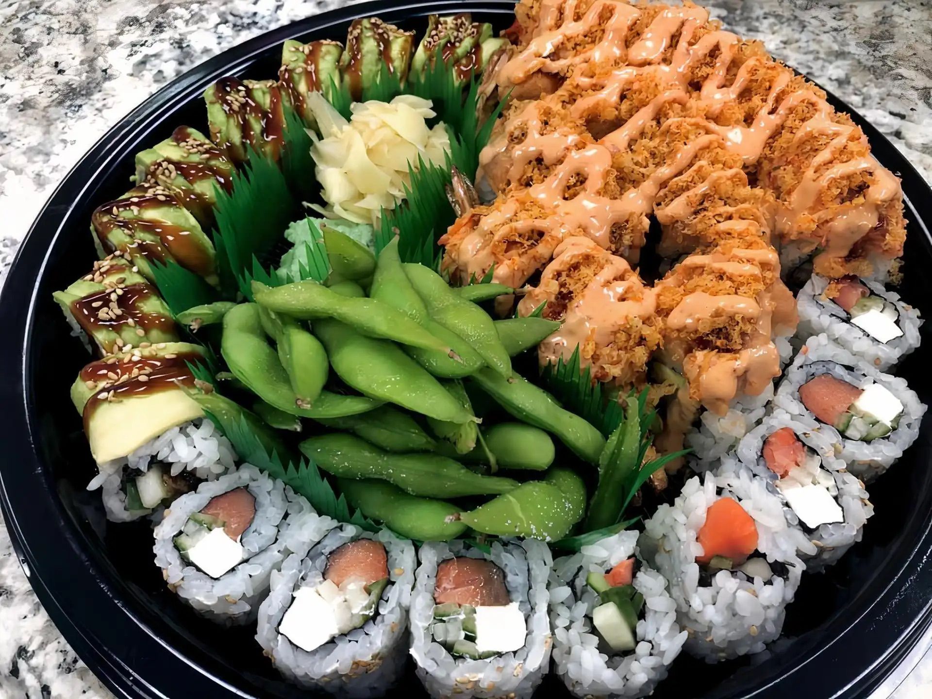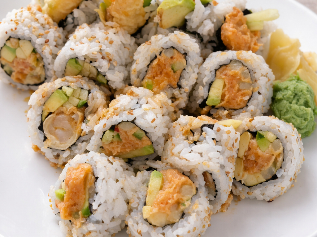 Nori, sushi rice, salmon, tuna, shrimp tempura, imitation crab shredded, avocado, cucumber, topped with eel sauce, spicy mayo and masago.
