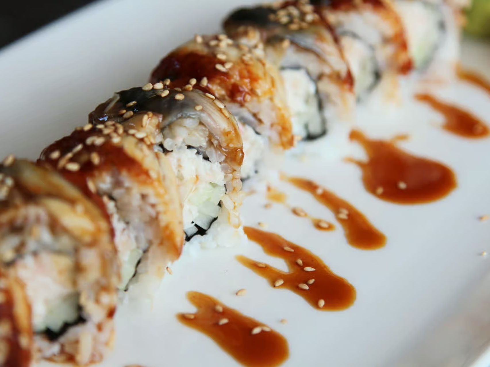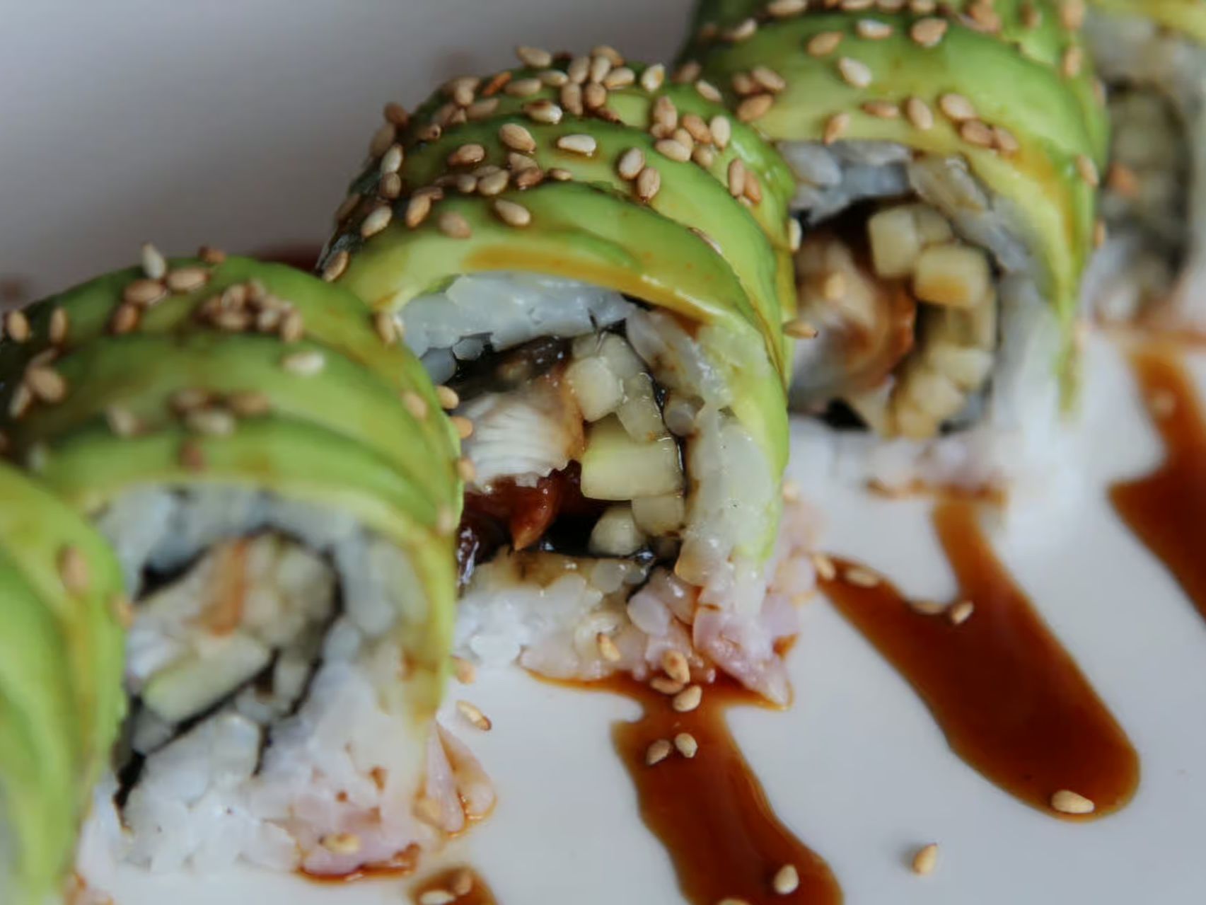 Nori, sushi rice, eel, cucumber, topped with avocado, eel sauce, sesame seed