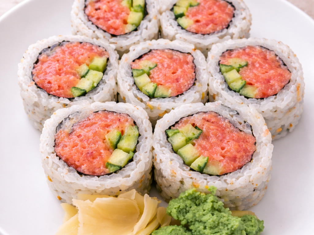 Nori, sushi rice, spicy yellowtail, cucumber, sesame seed