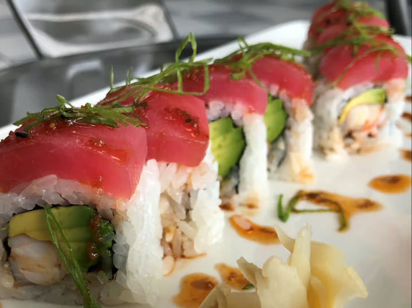 Nori, sushi rice, cooked shrimp, avocado, topped with tuna, homemade poke sauce and green onion.