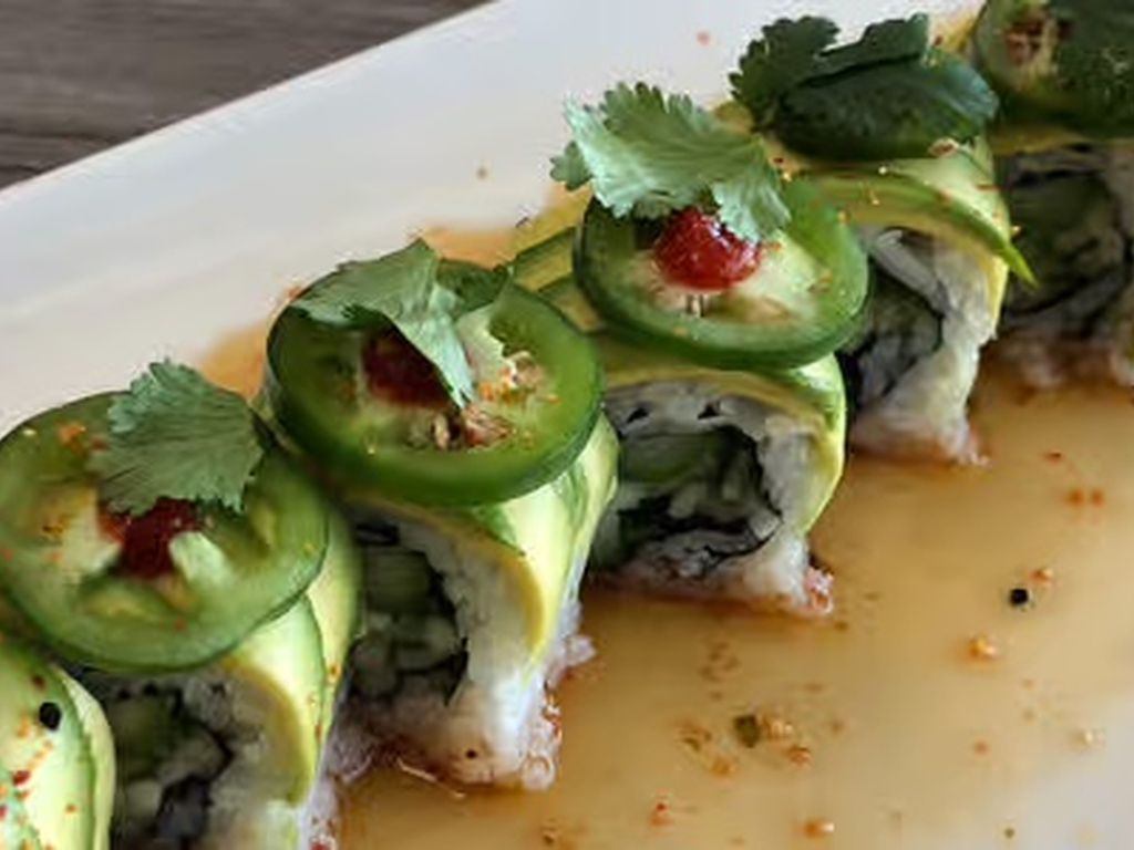 Nori, sushi rice, cucumber, asparagus, topped with avocado, jalapeno, togarashi, sriracha, served with yuzu ponzu