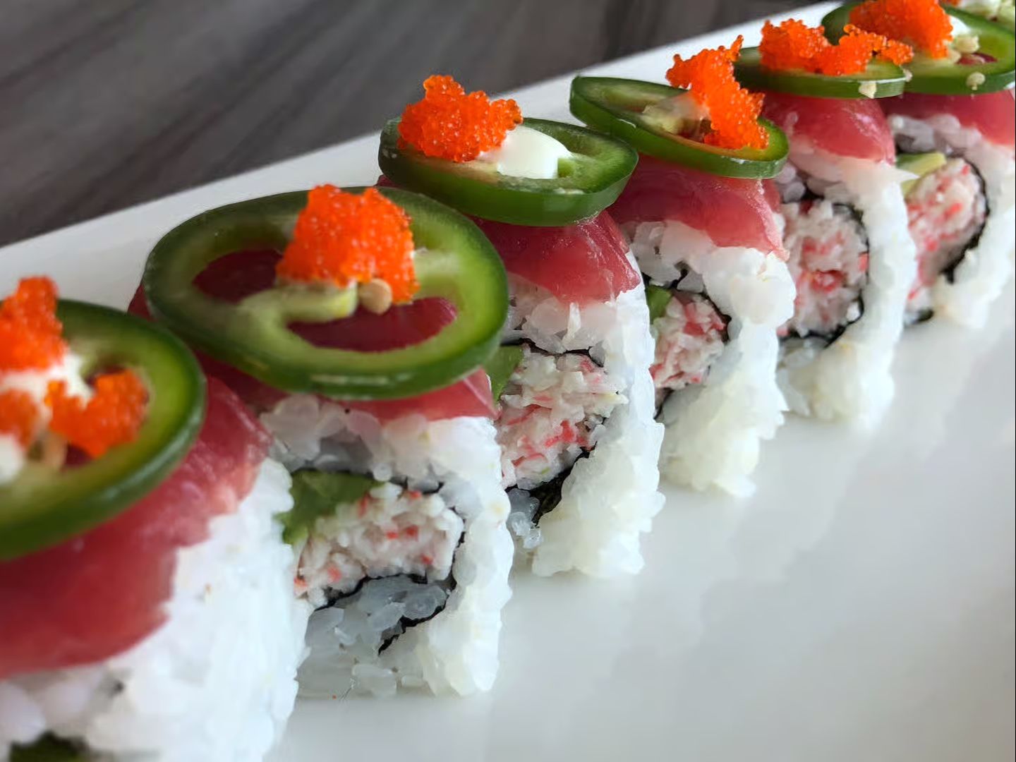Nori, sushi rice, imitation crab salad, cream cheese, avocado, topped with tuna, jalapeno, spicy mayo & masago.
