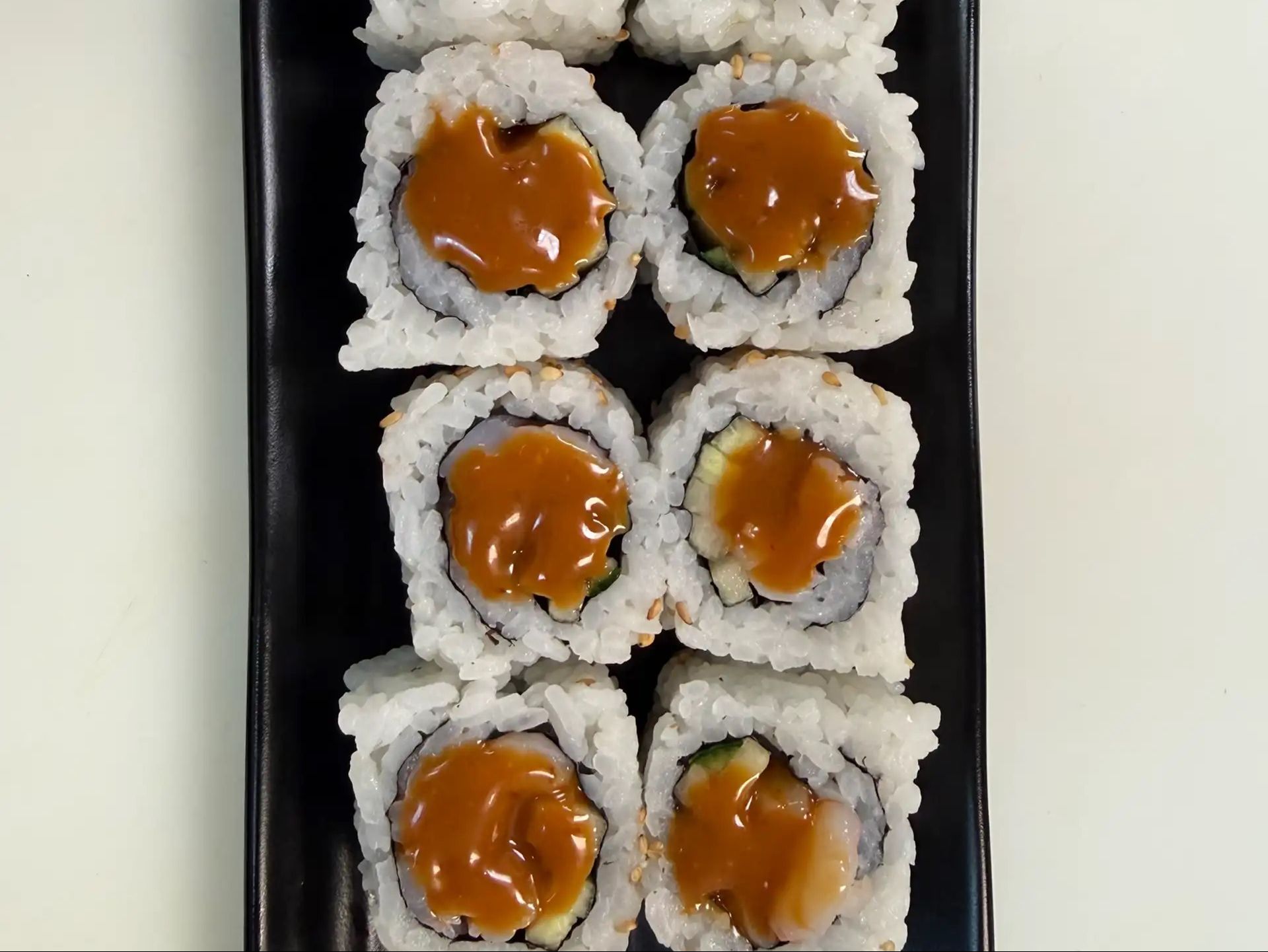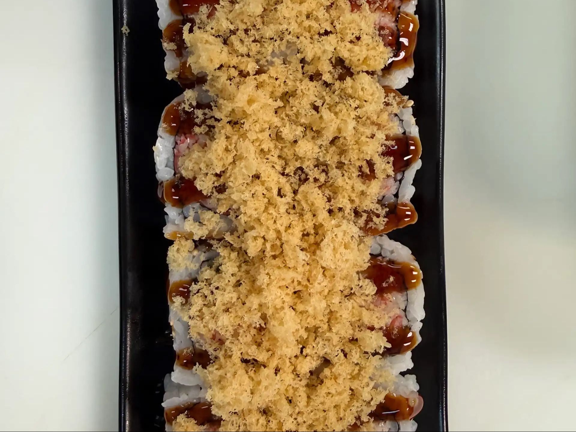 Nori, sushi rice, imitation crab salad, cucumber, topped with tempura crunch, eel sauce and sesame seed