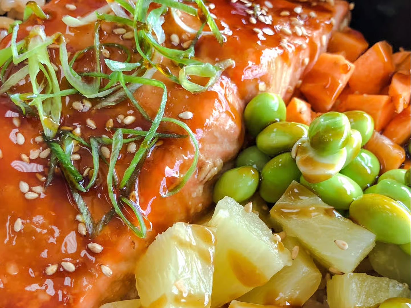 Fried rice, baked salmon teriyaki, edamame, carrot, pineapple, topped with teriyaki sauce, green onion & sesame seed.