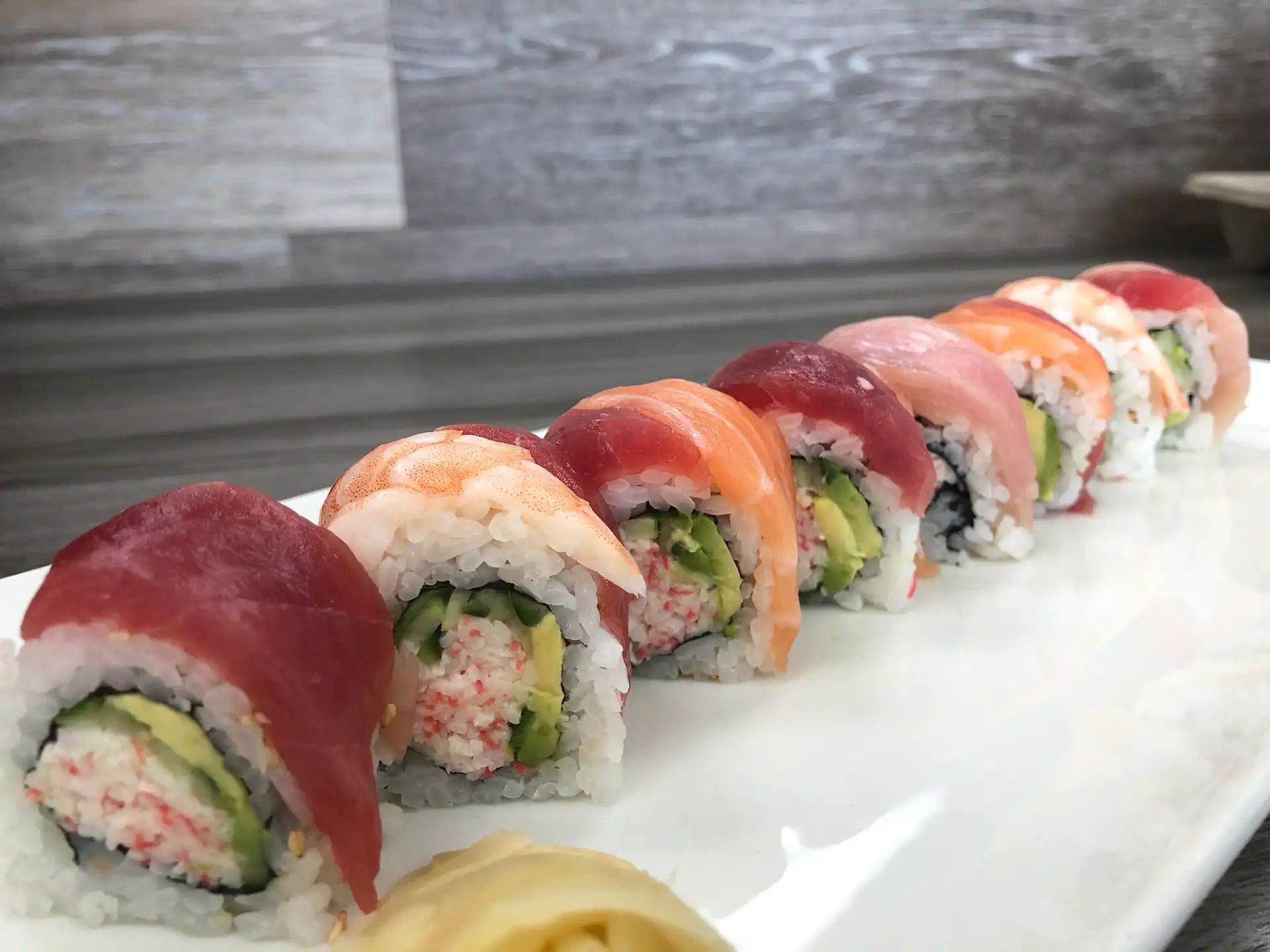California roll topped with tuna, salmon, yellowtail, avocado & cooked shrimp.