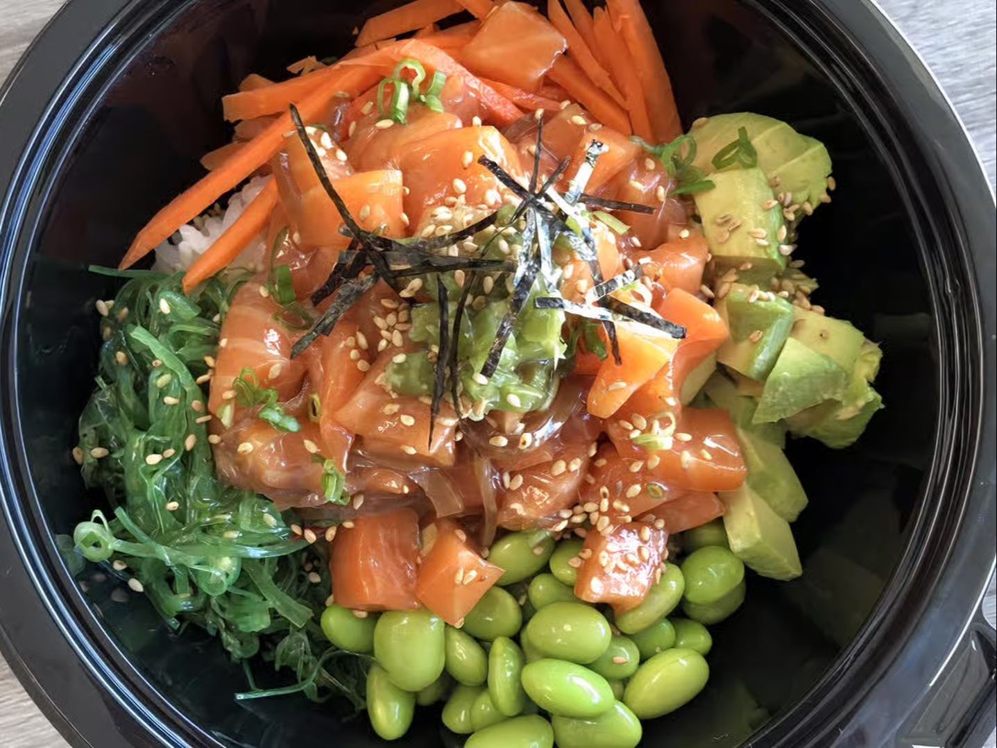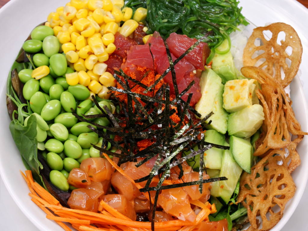 Half sushi rice half mixed greens, tuna, salmon, homemade poke sauce, poke sauce, edamame, cucumber, carrot, avocado, seaweed salad, corn, lotus root chip topped with masago and nori shredded.