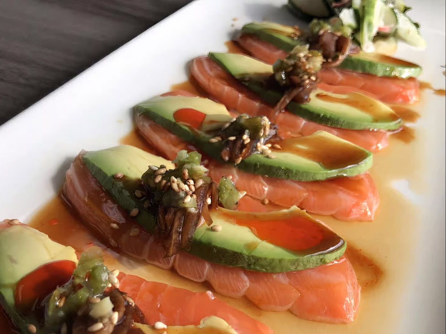 Salmon sashimi topped with avocado, pickled onion, pickled wasabi, sriracha, poke sauce, sesame seed, served with yuzu ponzu & cucumber salad