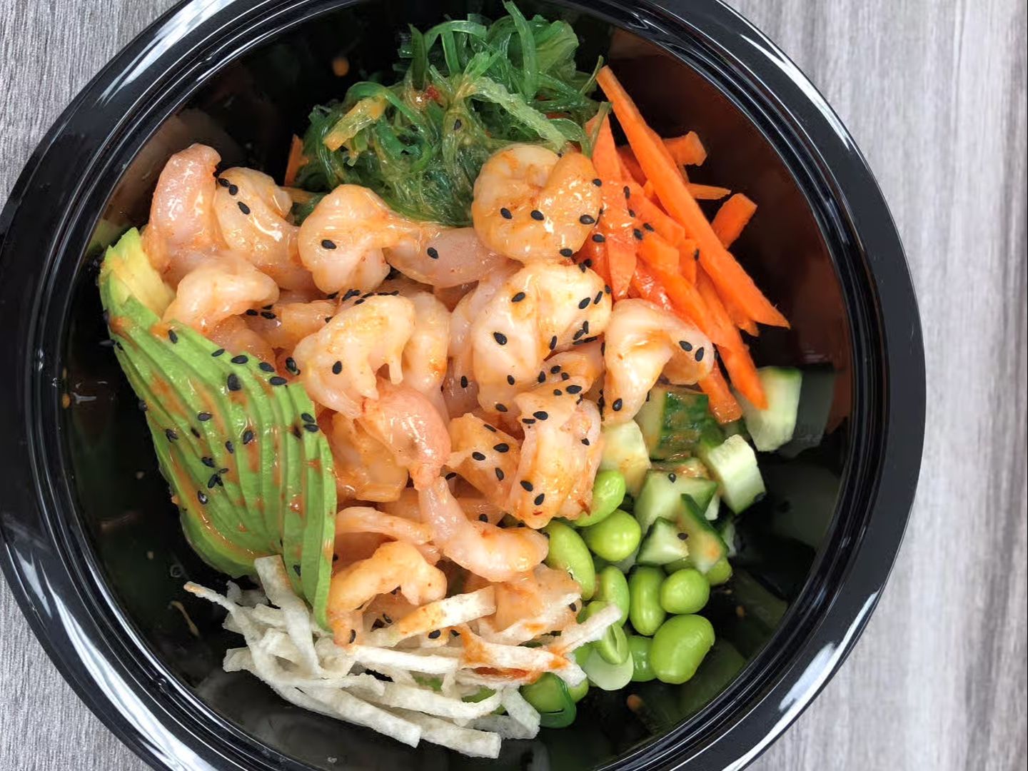 Sushi rice, cooked shrimp, spicy lemon sauce, edamame, carrot, avocado, seaweed salad, topped with black sesame seed, crispy wonton strip