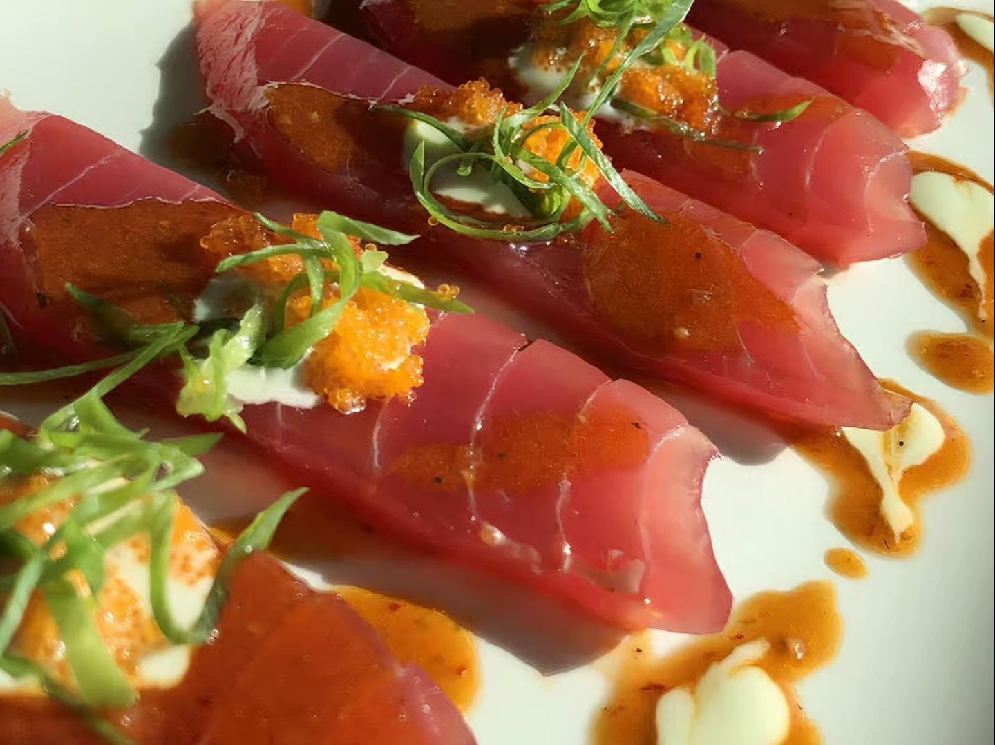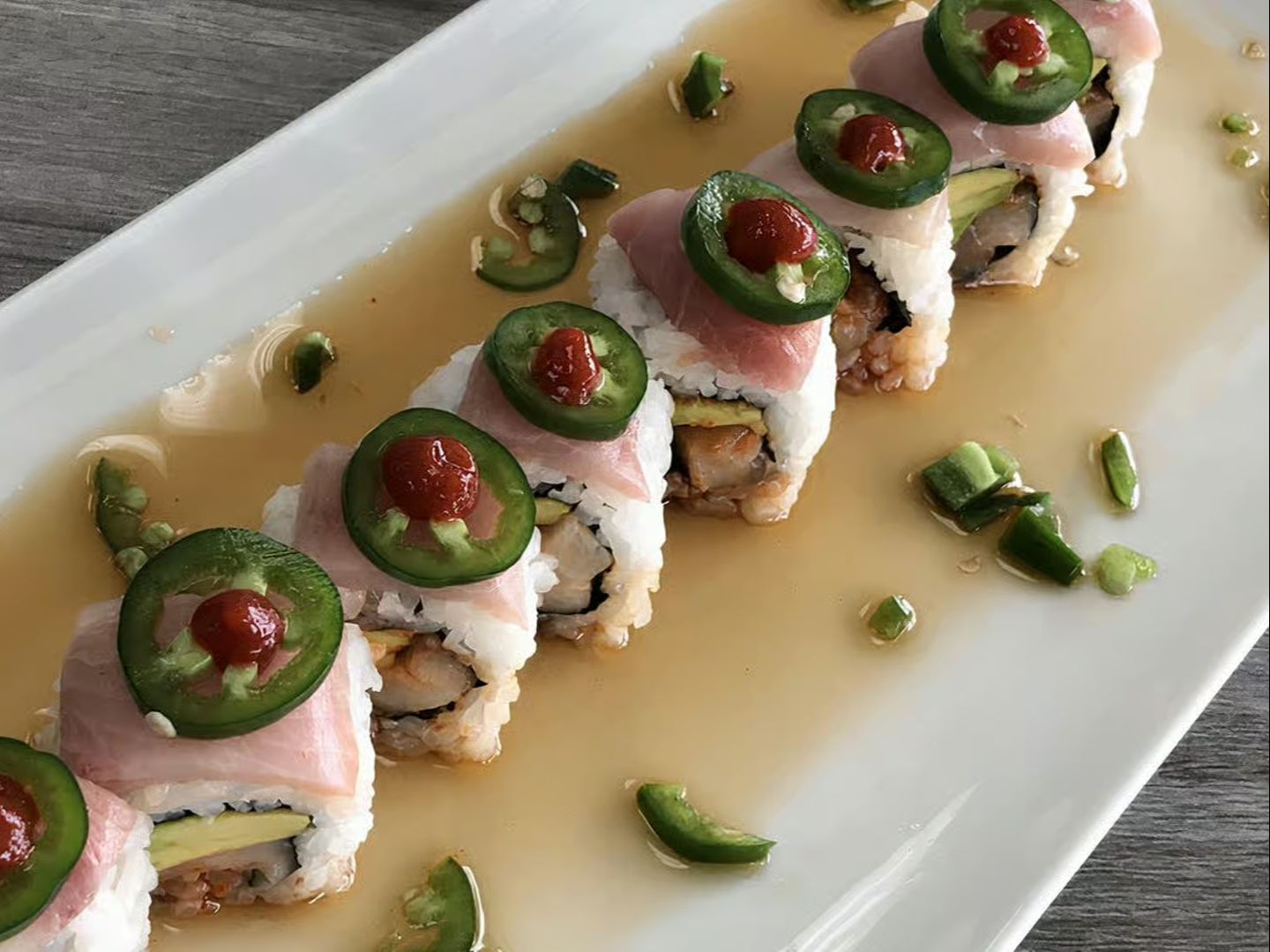 Nori, sushi rice, yellowtail, avocado, topped with yellowtail, jalapeno, togarashi, sriracha, served with yuzu ponzu.
