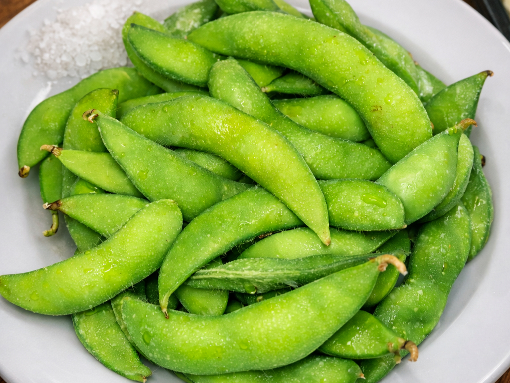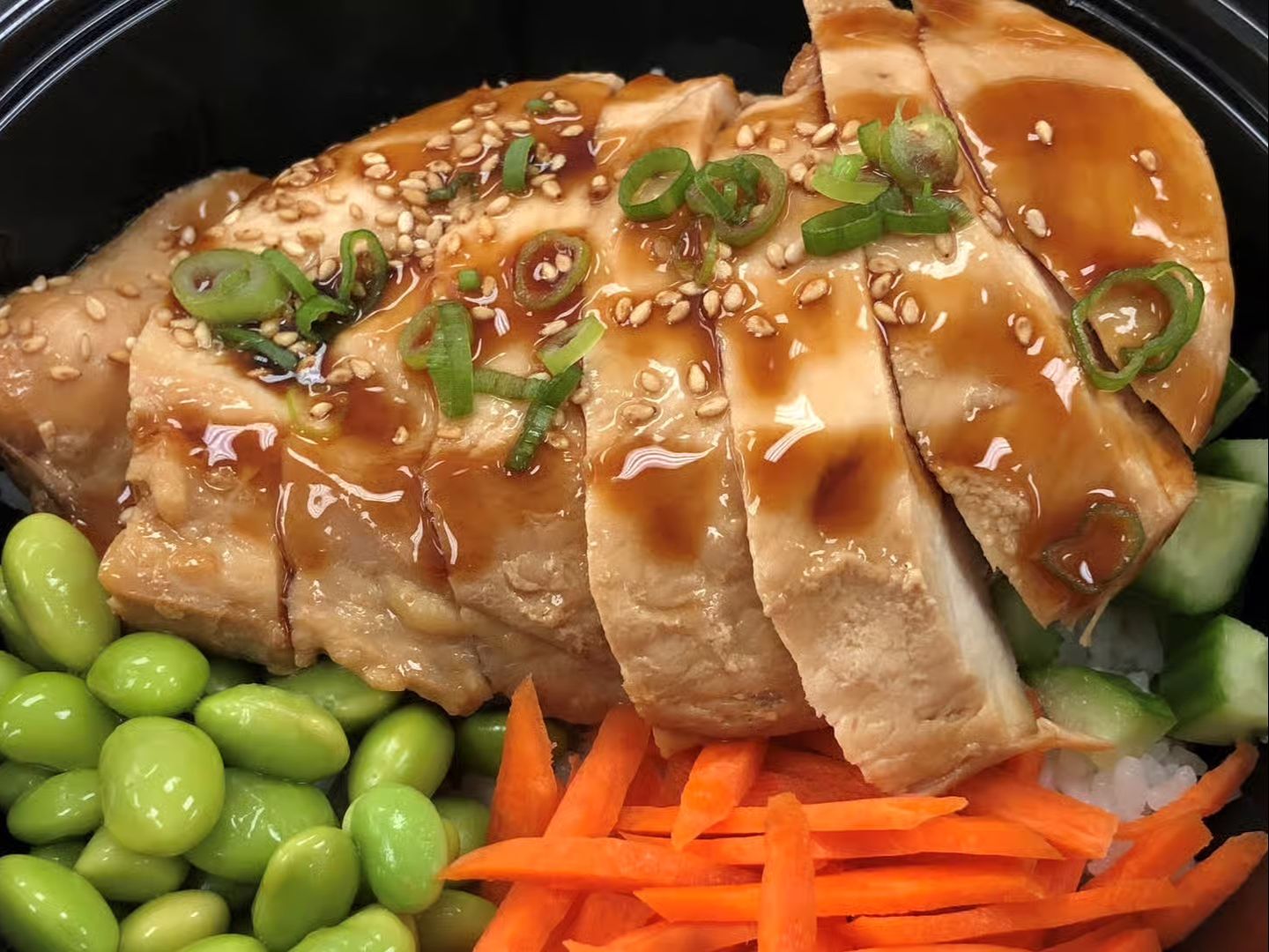 Sushi rice, backed teriyaki chicken, edamame, carrot, cucumber, topped with teriyaki sauce, sesame seed and green onion