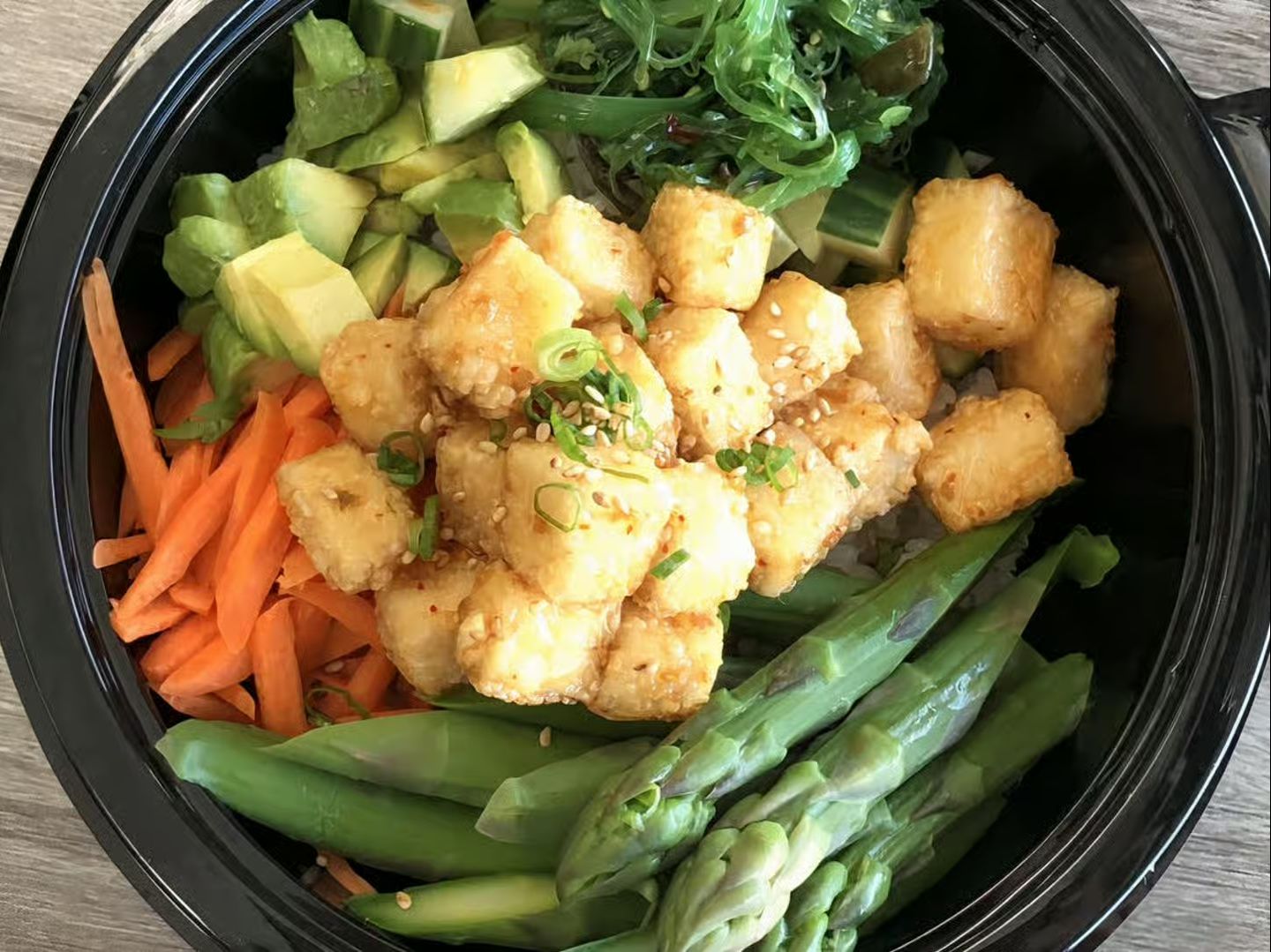 Sushi rice, furikake, fried tofu, homemade poke sauce, carrot, avocado, seaweed salad, cucumber, asparagus, topped with sesame seed and green onion