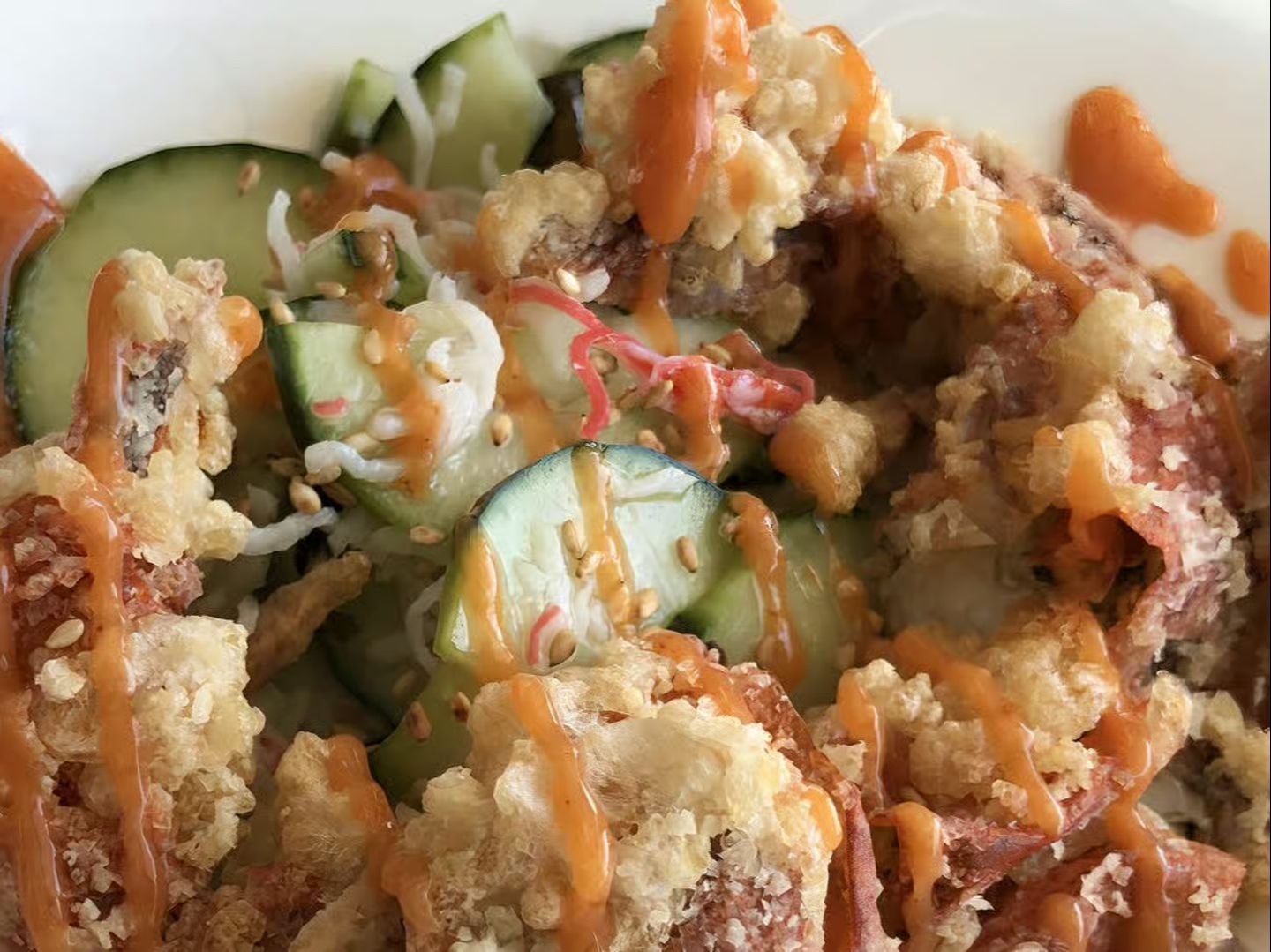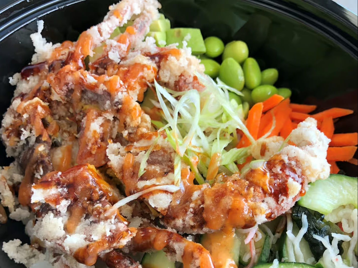 Sushi rice, spicy crab salad, shrimp tempura, poke sauce, spicy mayo, cucumber, carrot, avocado, lotus root chip, topped with spicy crunch mix and nori shredded.