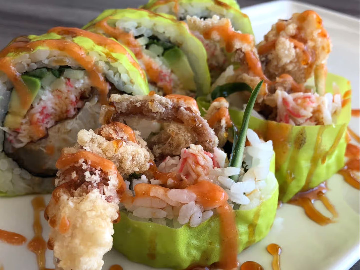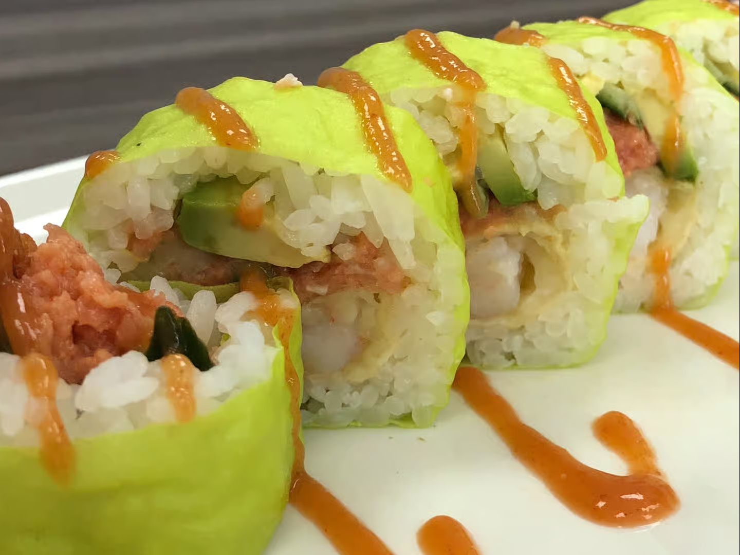 Nori, soybean wrap sushi rice, soft-shell crab, imitation crab mixed, cucumber, avocado, topped with dynamite sauce.