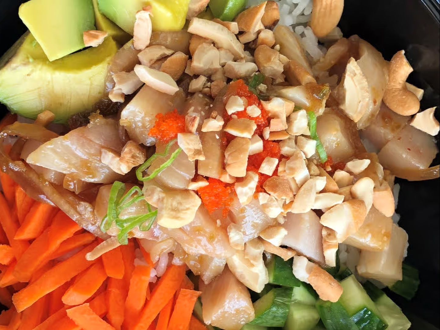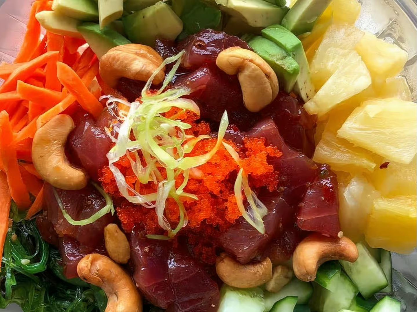 Sushi rice, tuna, Hawaiian sauce, avocado, cucumber, carrot, seaweed salad, pineapple, topped with masago, green onion, cashew nut