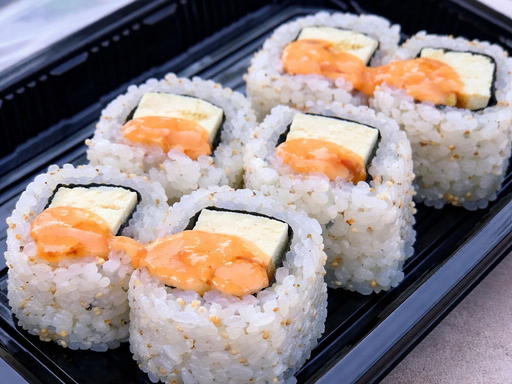 Nori, sushi rice, sesame seed, steamed tofu, eel sauce, spicy mayo.