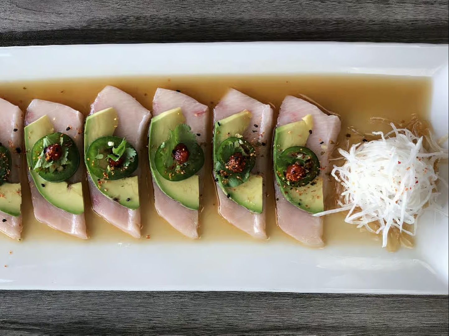 Yellowtail sashimi topped with avocado, jalapeno, sriracha, togarashi, served with yuzu ponzu sauce and seaweed salad