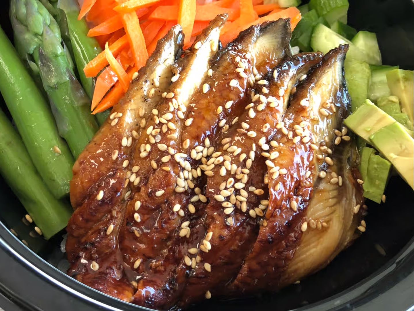 Sushi rice, baked salmon teriyaki, cucumber, carrot, edamame topped with teriyaki sauce, sesame seed and green onion