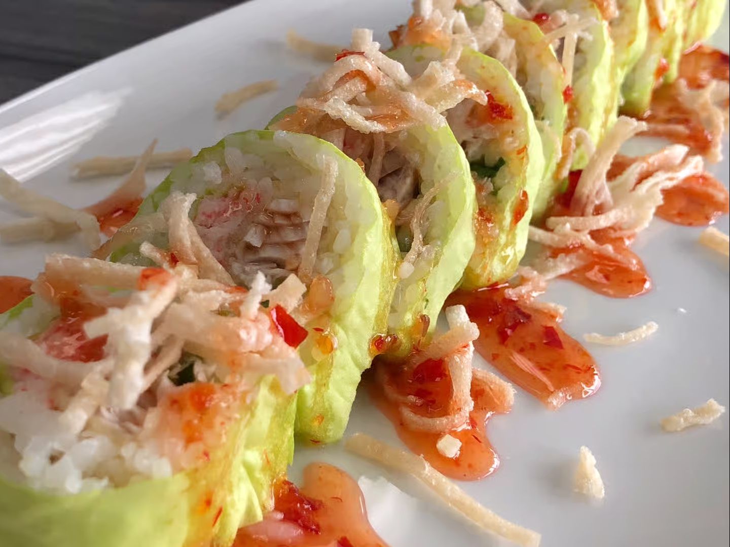 Soybean wrap, sushi rice, yellowtail tempura, imitation crab mixed, cucumber, avocado, topped with sweet chili sauce & crispy wonton strip.