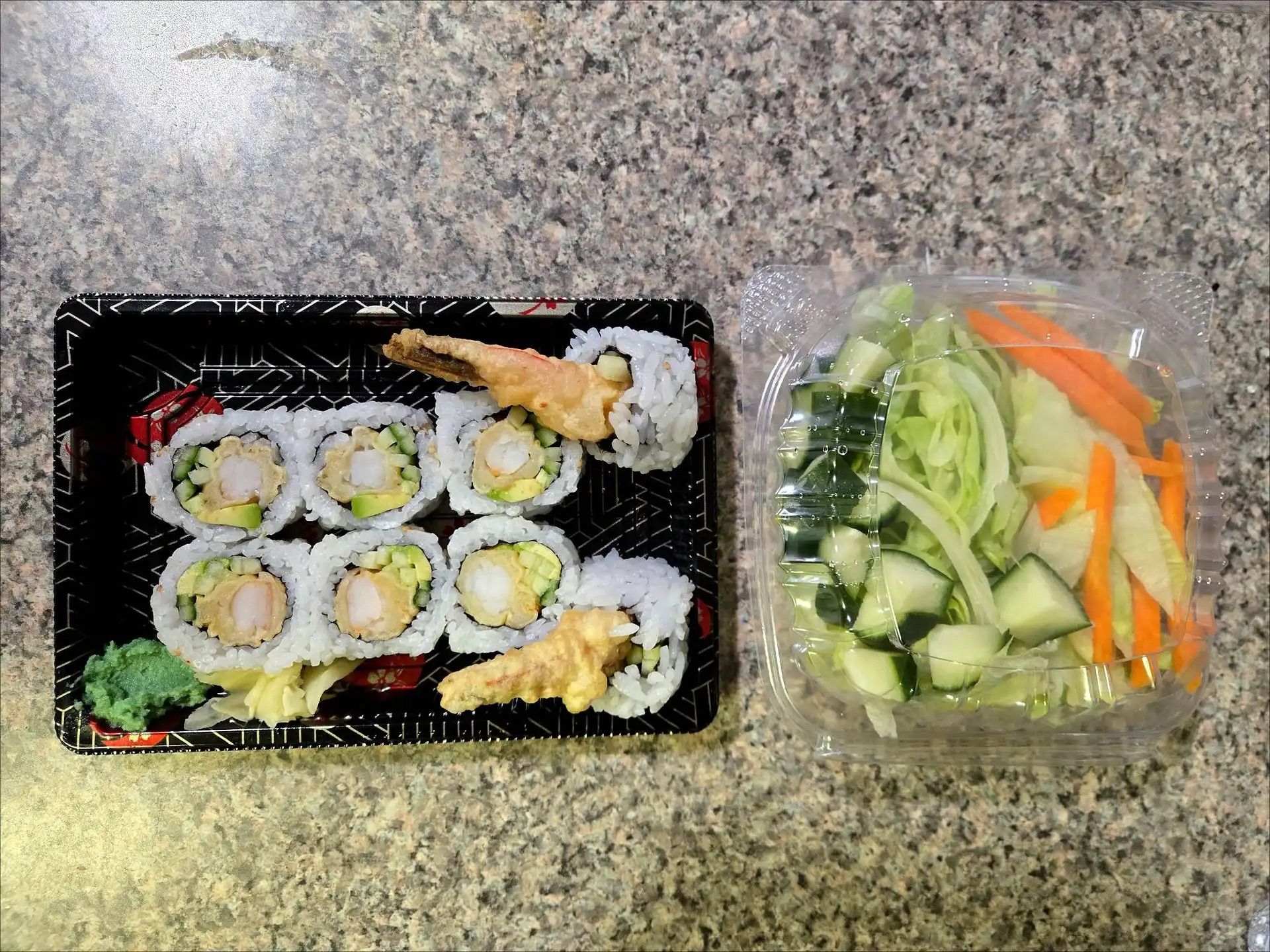 Nori, sushi rice, imitation crab salad, cucumber, avocado, sesame seed