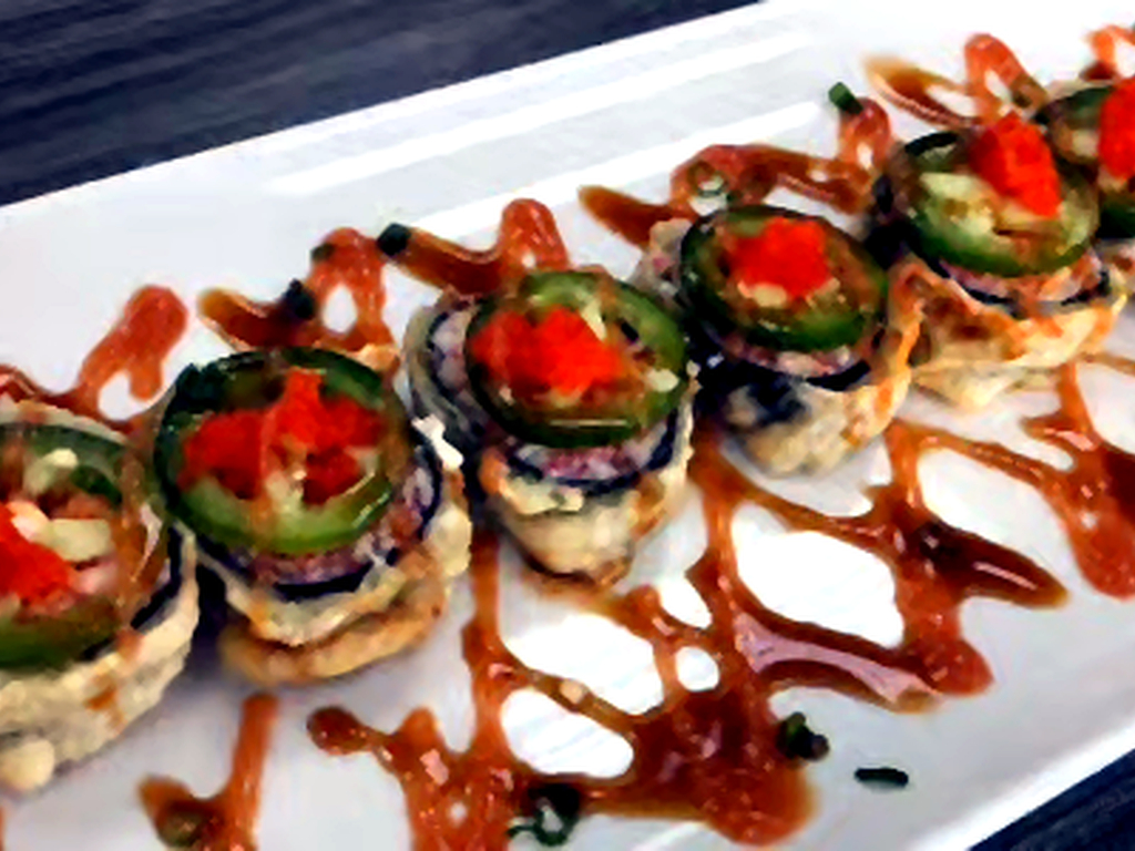 Deep fried in tempura batter: nori, imitation crab mixed, cream cheese, sriracha, topped with jalapeno, masago and dynamite sauce.