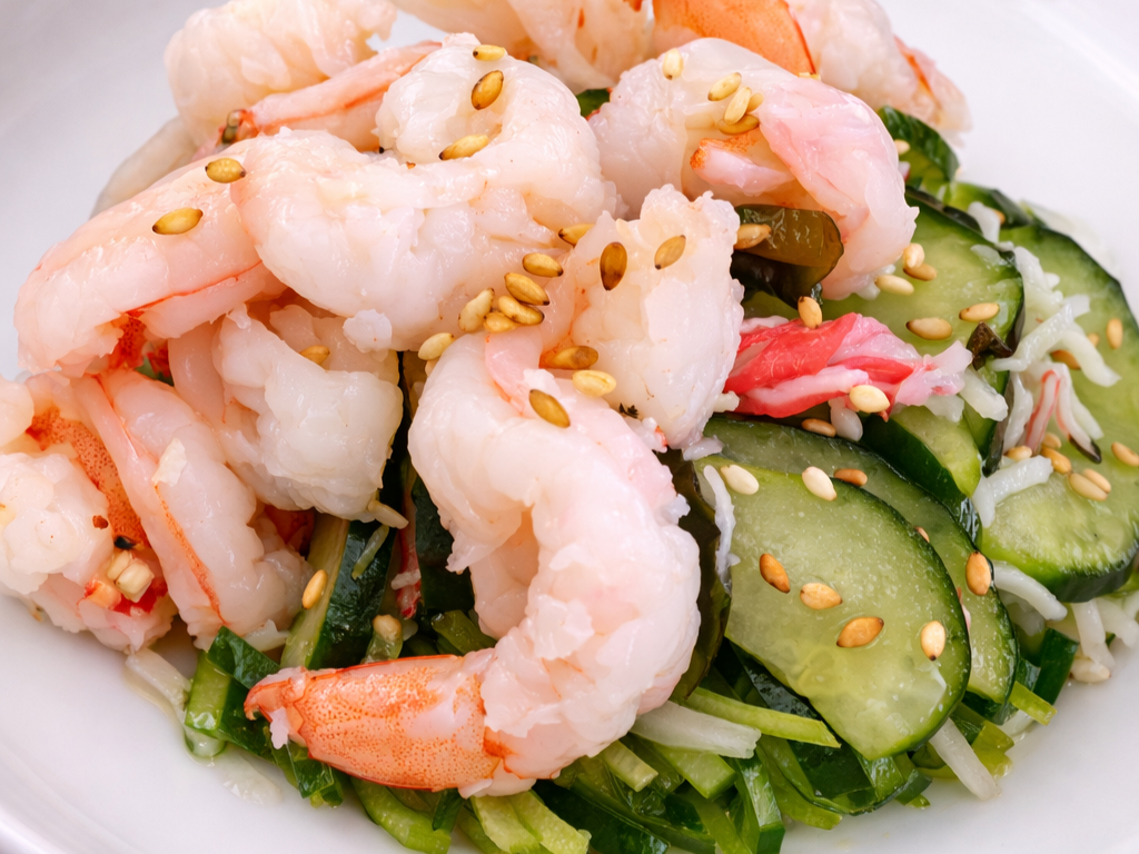 Tangy cucumber mixed with imitation crab, rice vinegar, sugar, seaweed, topped with sesame seed.