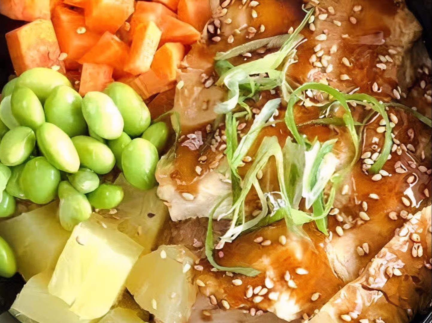 Fried rice, baked teriyaki chicken, edamame, carrot, pineapple, topped with teriyaki sauce, green onion and sesame seed.