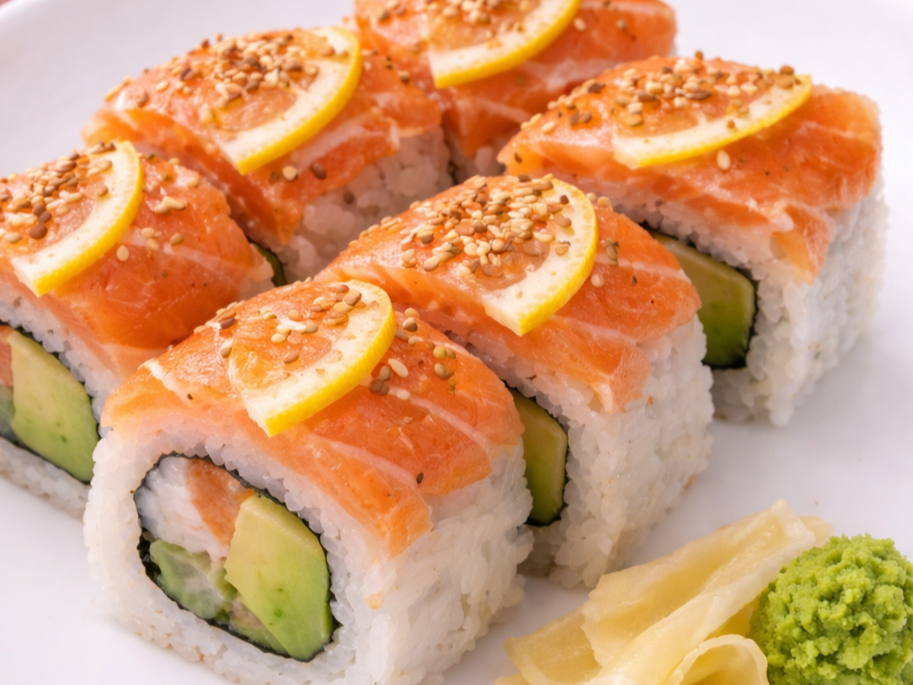 Nori, sushi rice, salmon, avocado, topped with salmon, lemon slices and sesame seed.